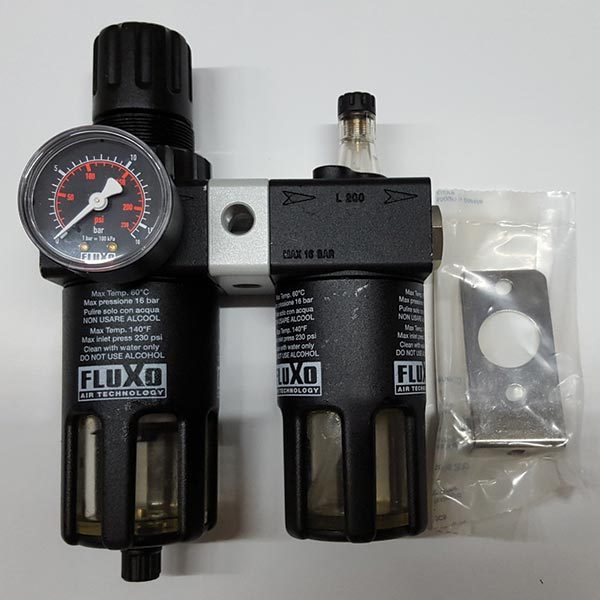 GRUPPO COMPLETO IN LINEA-FILTRO CONDENSA CON SCARICO MANUALE-REGOLATORE DI PRESSIONE INTEGRATO E LUBRIFICATORE DI LINEA CON MANOMETRO E STAFFA DI FISSAGGIO INCLUSI